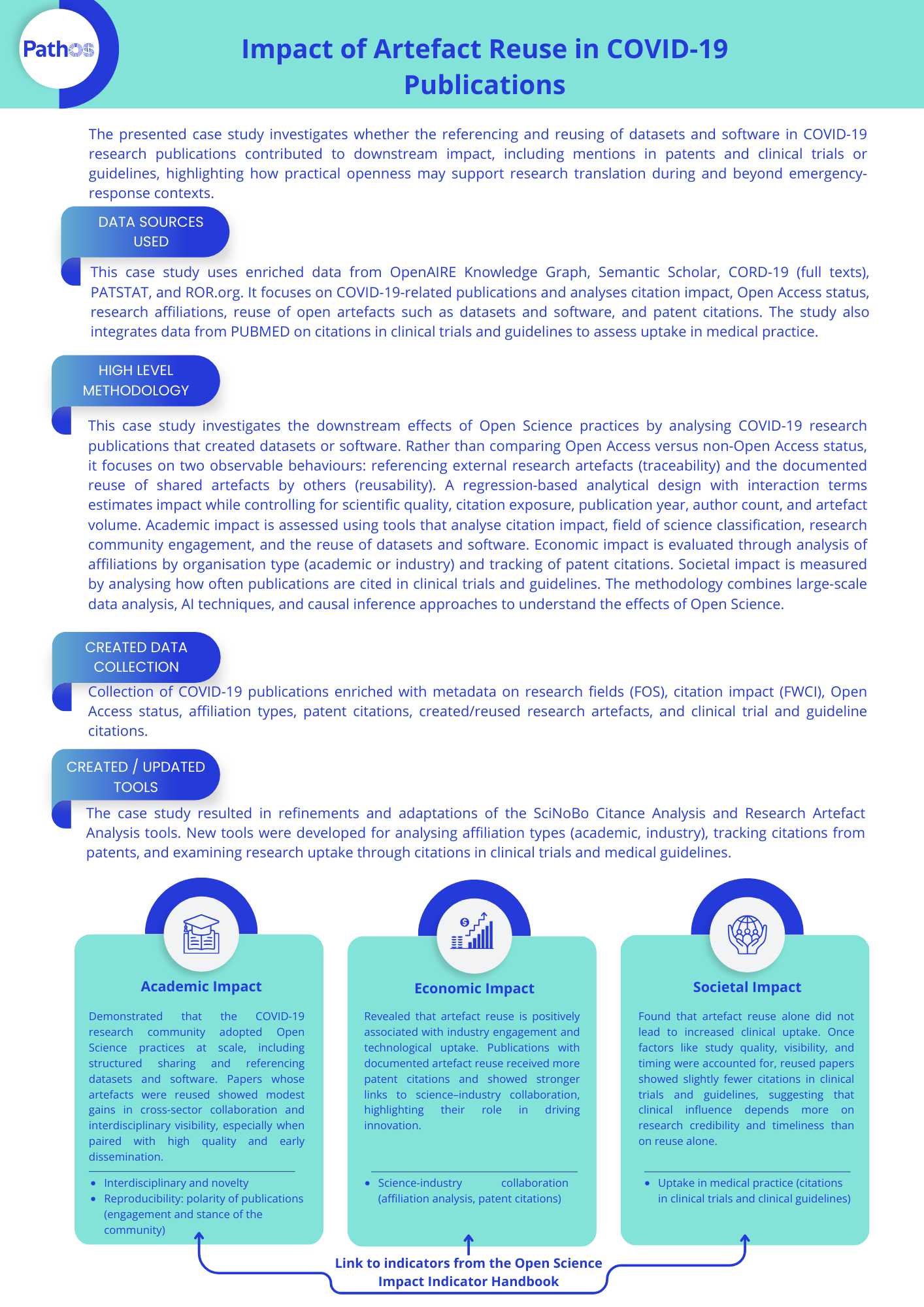 Using a quantitative and data-driven methodology, PathOS will compare Open Access (OA) vs. non-OA publications to establish the impact of openly shared research outputs on critical areas such as science-industry collaboration, artifact reuse and quality, and clinical adoption. This includes assessing whether OA strengthens partnerships with industry, as evidenced by affiliations and patents, and whether it facilitates greater reuse and perceived quality of research artifacts. Additionally, the study evaluates the role of OA in driving clinical uptake by analyzing citations in clinical trials and related healthcare applications.
